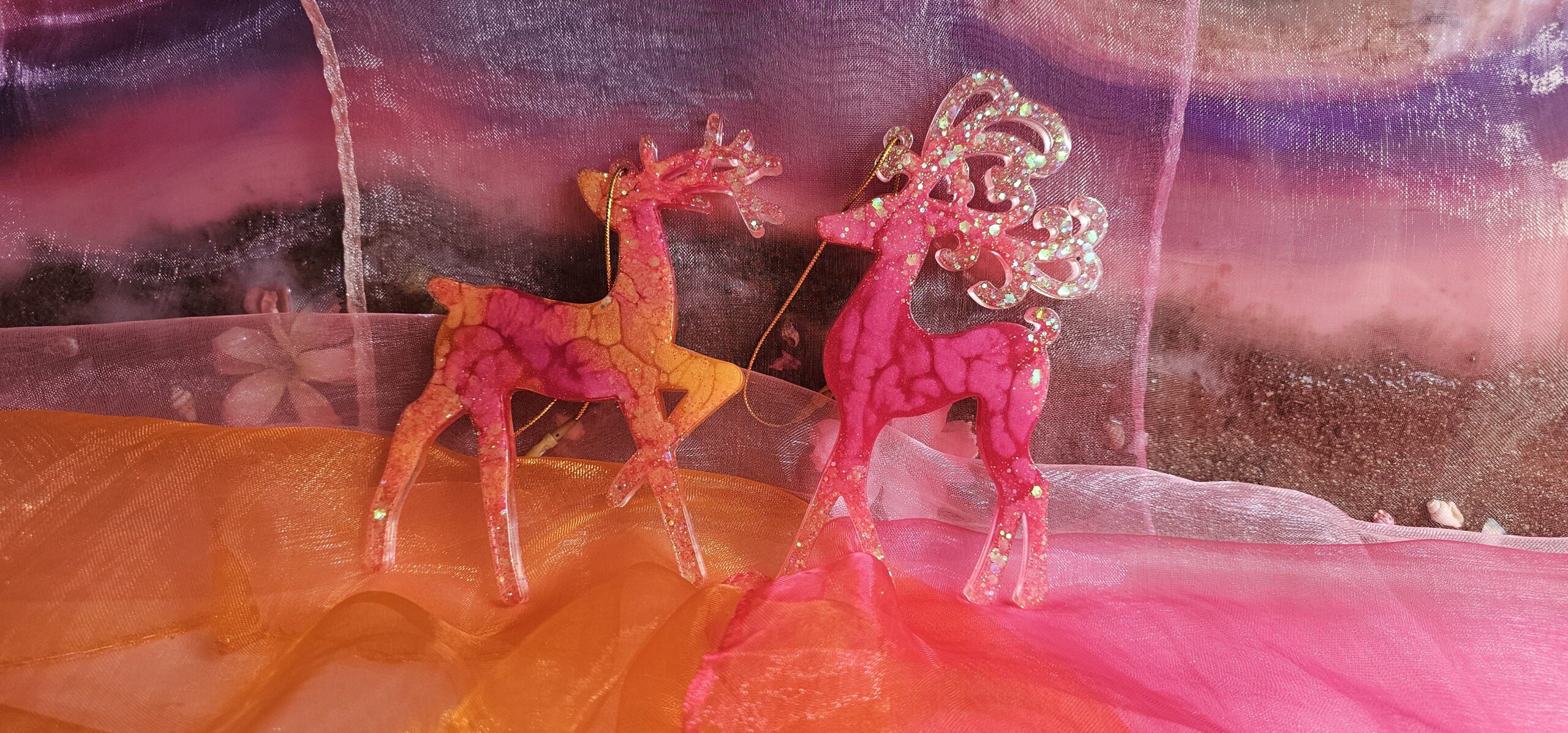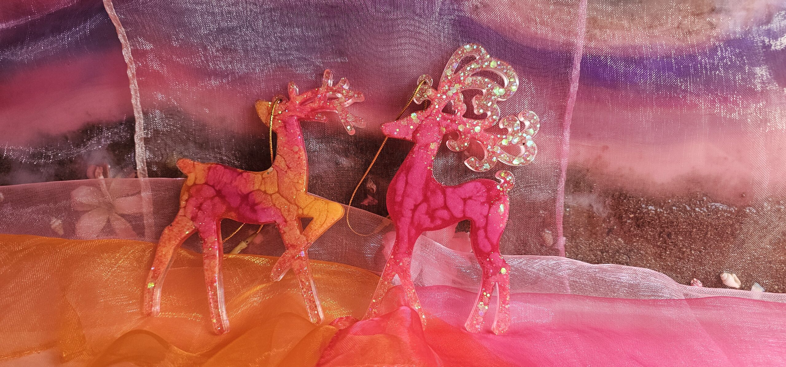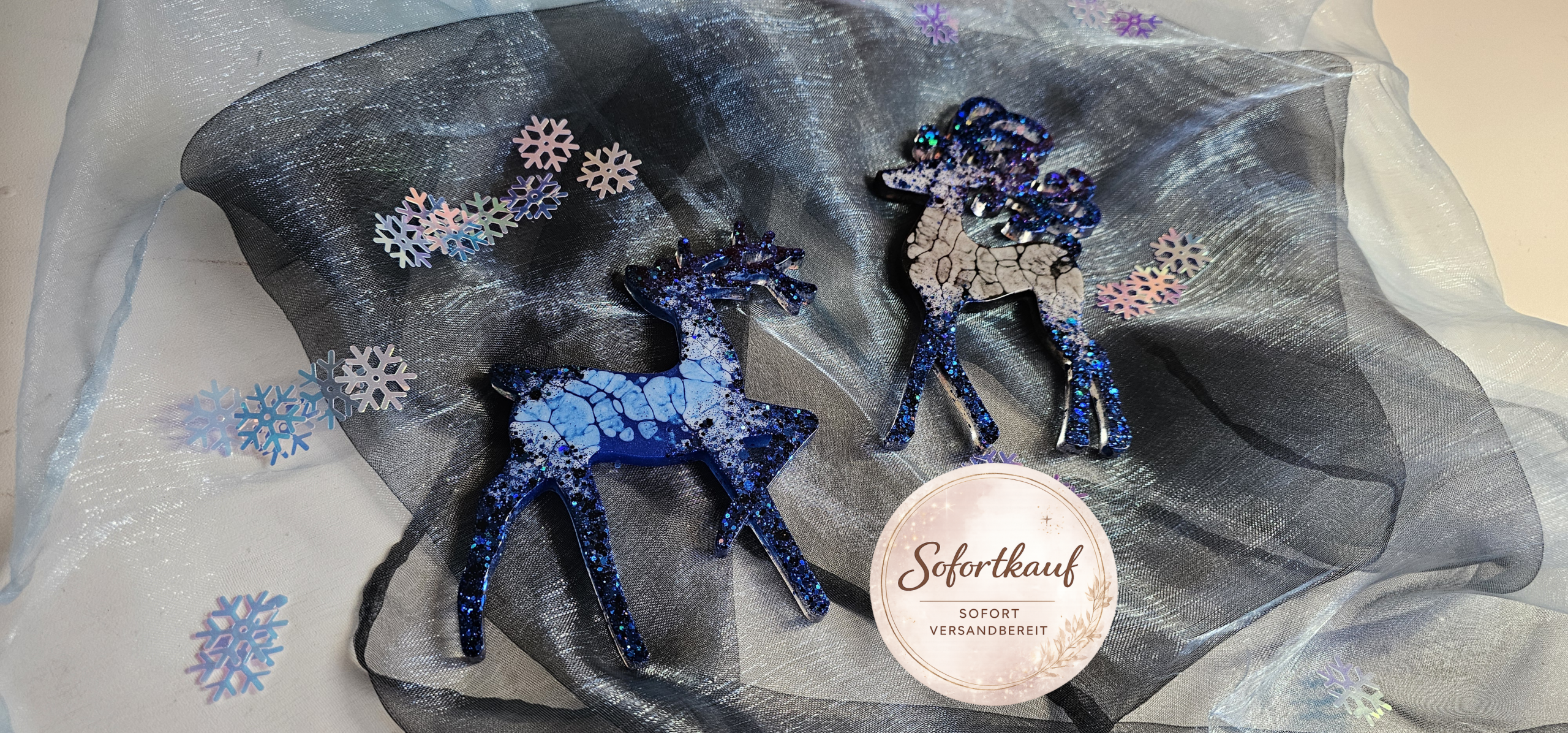 Zauberhafter Baumschmuck Weihnachten Rentier 2er Set. Handgefertigte Unikate aus Epoxidharz, die mit ihrem Glanz jeden Weihnachtsbaum veredeln. Leicht, bruchsicher und mit viel Liebe zum Detail gestaltet – das perfekte Geschenk für das Fest der Liebe. Du hast eine ganz bestimmte Vorstellung von deinem Weihnachtsglück? Kein Problem! Auf unserer Startseite kannst du uns deine individuellen Wünsche mitteilen. Wir fertigen dein Rentier-Set gerne in deinen Lieblingsfarben an.