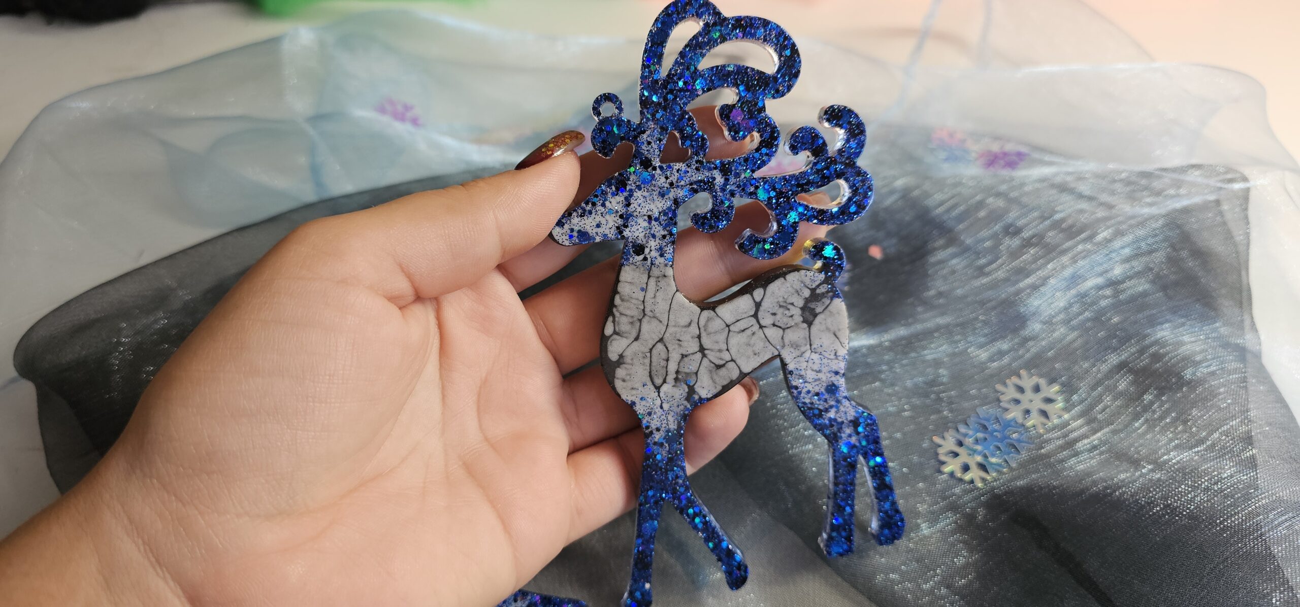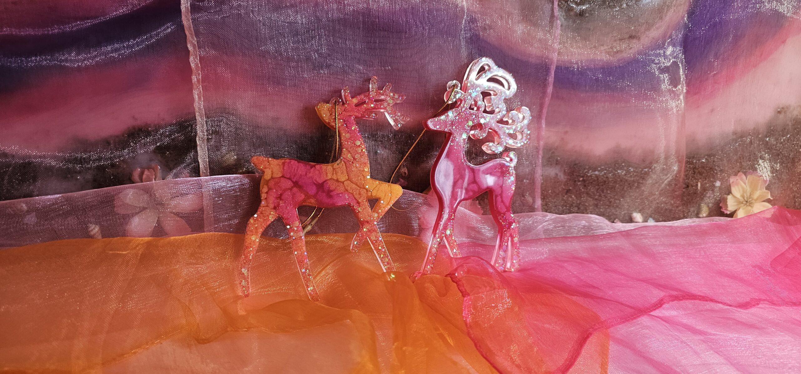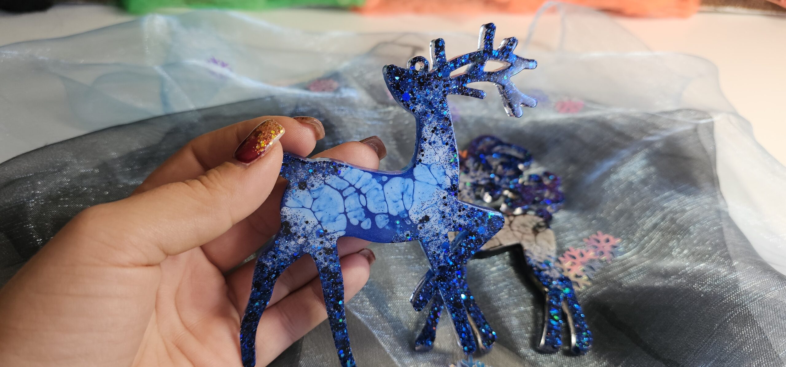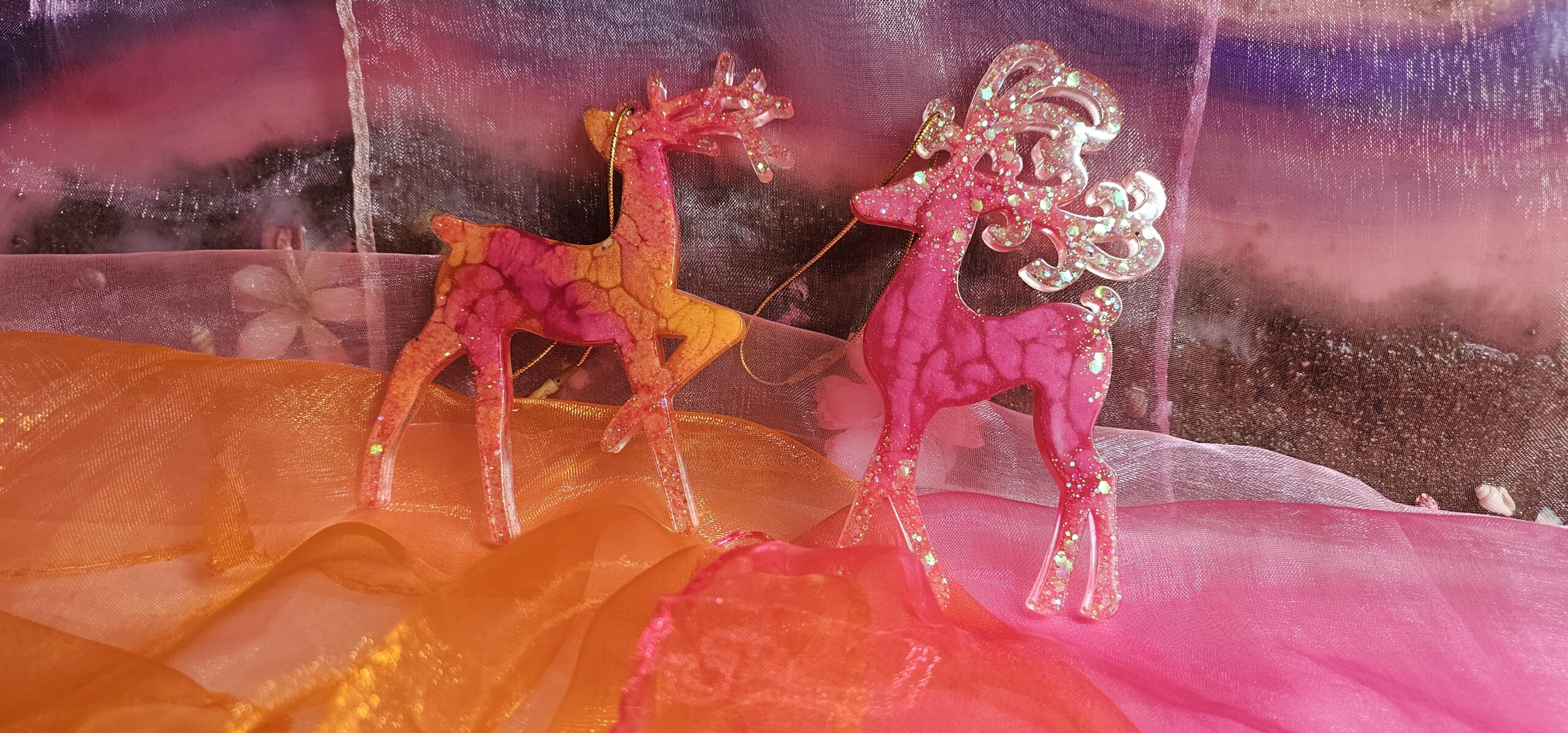 Zauberhafter Baumschmuck Weihnachten Rentier 2er Set. Handgefertigte Unikate aus Epoxidharz, die mit ihrem Glanz jeden Weihnachtsbaum veredeln. Leicht, bruchsicher und mit viel Liebe zum Detail gestaltet – das perfekte Geschenk für das Fest der Liebe. Du hast eine ganz bestimmte Vorstellung von deinem Weihnachtsglück? Kein Problem! Auf unserer Startseite kannst du uns deine individuellen Wünsche mitteilen. Wir fertigen dein Rentier-Set gerne in deinen Lieblingsfarben an.