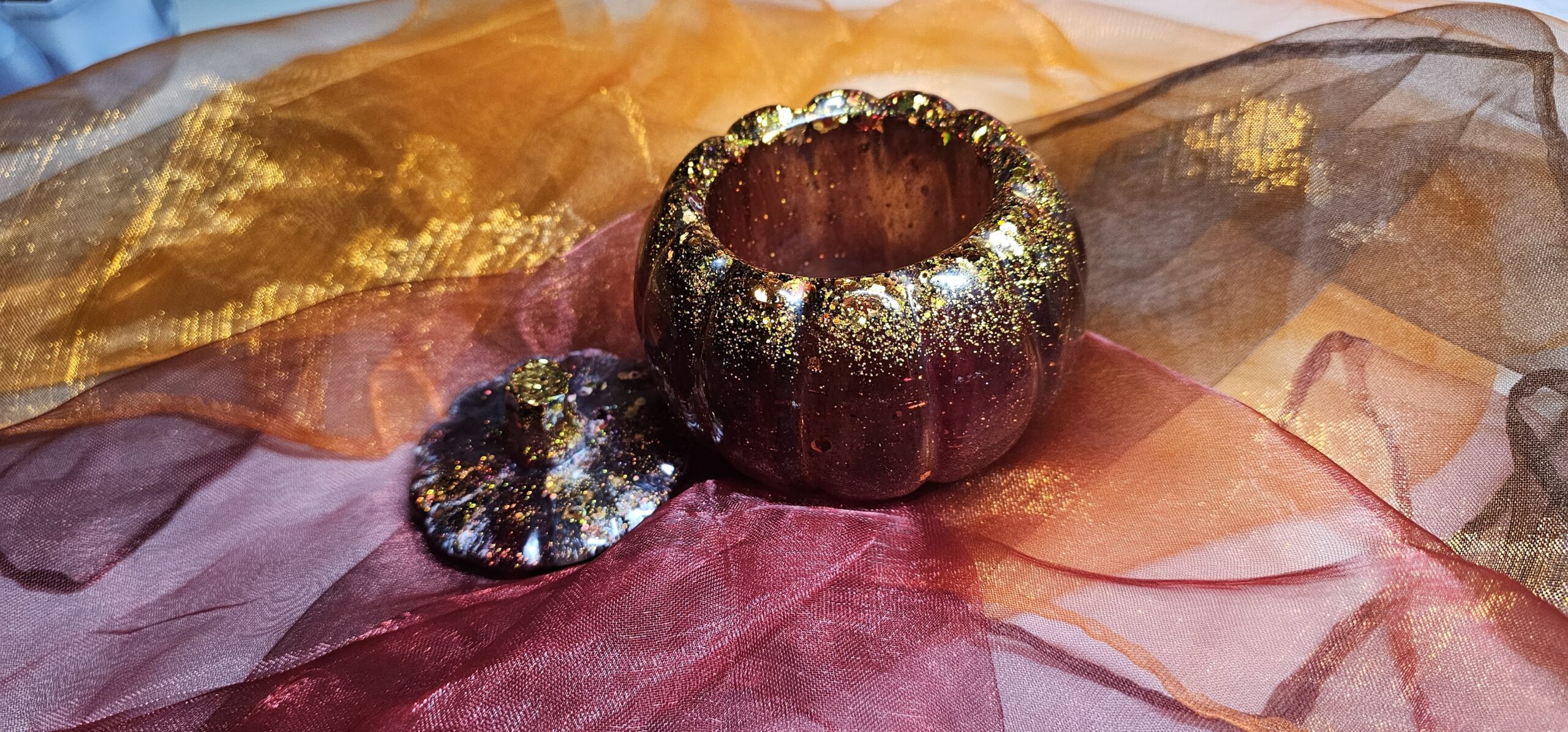 Der Deckel der Schatulle ist als kleiner Kürbisstiel gearbeitet und sitzt passgenau auf der Dose. Dadurch eignet sich die Kürbis Schatulle Epoxidharz ideal für die stilvolle Aufbewahrung von Schmuck, Süßigkeiten, Teelichtern oder kleinen persönlichen Erinnerungsstücken. Gleichzeitig ist sie eine wunderschöne Tisch- und Herbstdekoration, die durch ihren Glanz und die feinen Details besticht.